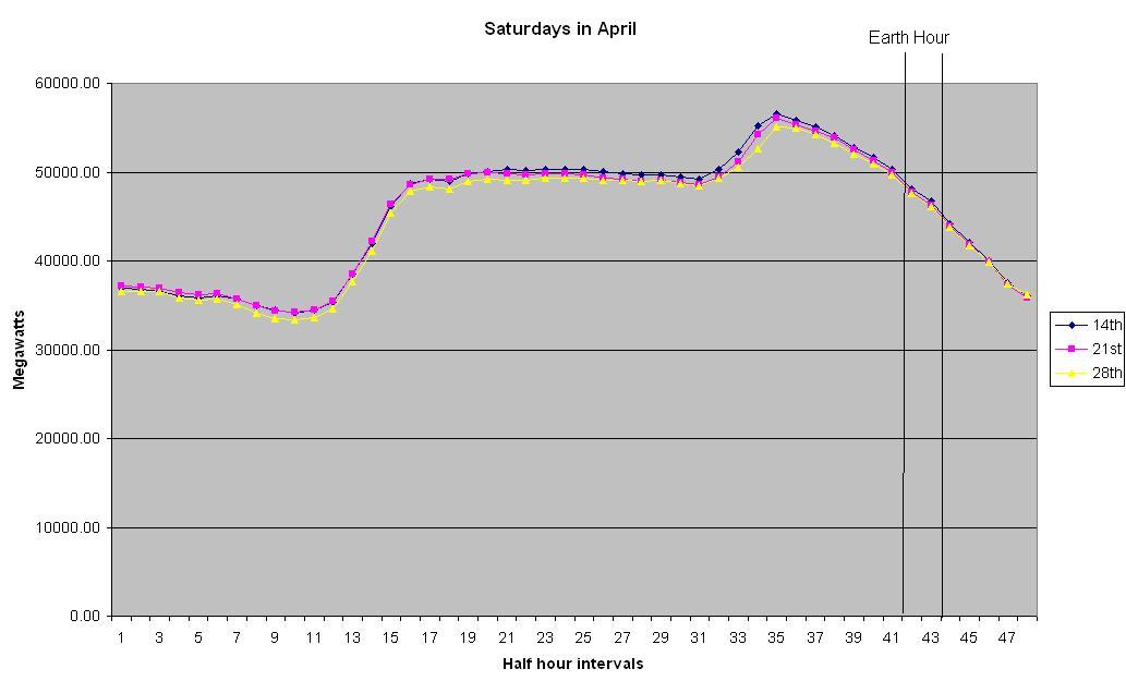 Ian Grey has the answer to my question about Earth Day power consumption in the UK. It's quite a technical answer, as is his wont, but the upshot is – the Brits ignored it too.