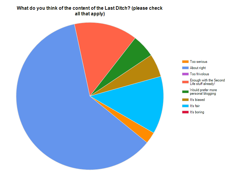 More than 50 readers were kind enough to reply to my questionnaire. I think there may be a problem (as always with blogging) that this was a self-selected group of enthusiasts as they were far kinder than I would have been myself. I shall ponder and seek to improve. The graph (click to enlarge) shows what respondents thought about the content. I shall certainly take the advice about Second Life to heart.