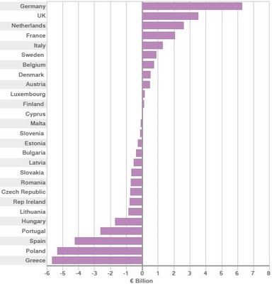 Given the graph he posted the other day, by what logic is Britain such a huge net contributor? Why is Poland, doing better in the crisis than most other EU countries, taking so much from the Germans, Brits and Dutch? I lived there 11 years and love the place dearly, but do they think we have some moral obligation to compensate for their years of suffering under Communism? Though they like to blame it on the Russians now, let's not forget the KGB was founded by a Pole. As for the Greeks, really guys! A few millennia is long enough for anyone to rest on their laurels, however magnificent. It might be time to roll up your sleeves and do a bit again.