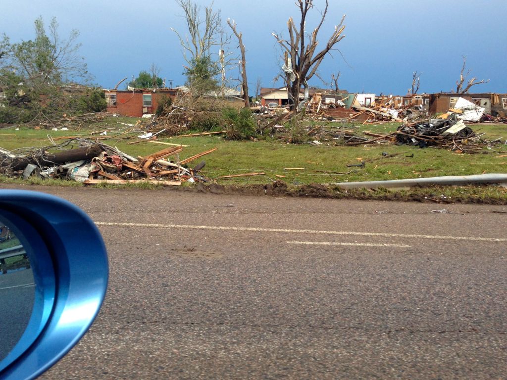I didn’t see any rubberneckers, but I can understand how the idea might get into circulation. We processed at 3-6 miles per hour past the devastated community of Moore. Highway I-35 runs right through it. Before we came upon the tornado damage, there was the poignant sight of signs advertising the town’s attractions. While standing still alongside damaged housing, I took a snapshot. It wasn’t why I was there. Indeed I had told the guy at the Welcome Center, while expressing my sympathy for his fellow-Oklahomans that had suffered, that I would rather take another route than cause any delays to the work being done. Still, I guess a passing “first responder” might have seen me do it and thought that was why I came.