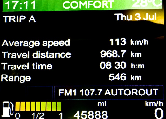I boarded the 0720 shuttle to Calais arriving in time to be on the road at 0900 French time as planned. The trip computer readings tell the story of the day. For most of it I was on a well-worn route to the South of France, passing places I have seen many times before. Then I turned off towards first Geneva and Turin to reach my home for the night in the shabbiest hotel I have ever encountered in France. It's like a gypsy encampment without the romance – and it doesn't have air conditioning. I know. First world problems. I am tired enough to sleep in it – despite the odd whiff – even if I have to sleep in a cold bath.