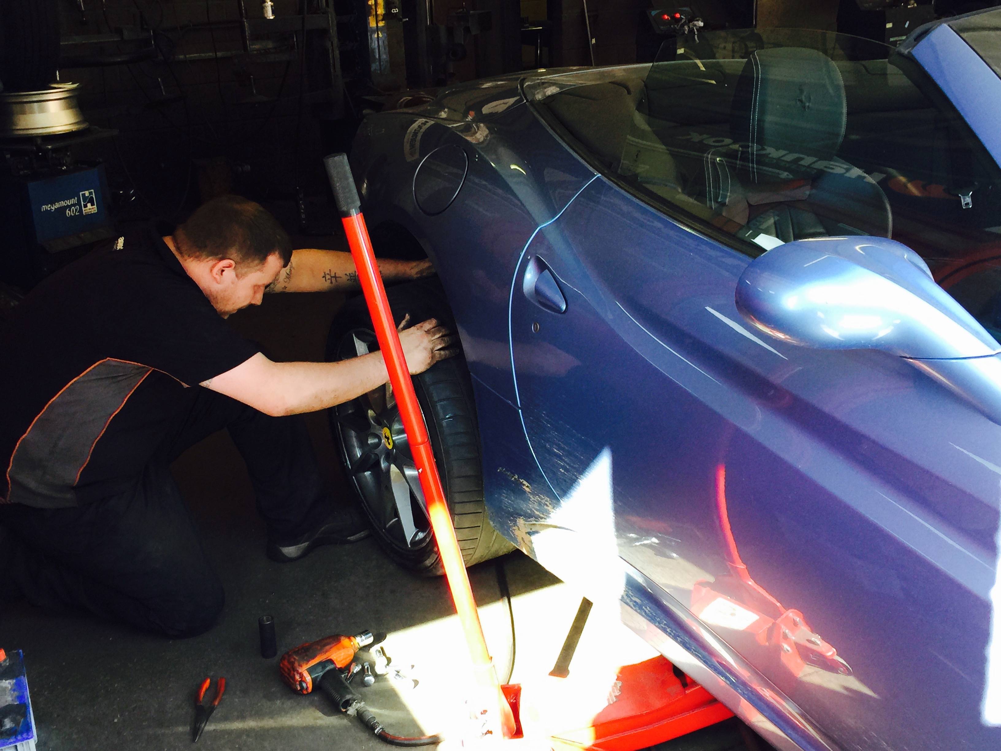 However the boss there came up with a better idea. He remembered they had recently put a complete set of new tyres on the Ferrari California of one of the directors of Celtic Football Club. They had kept the old tyres knowing that there is no spare in the car and thinking they might come in handy as short term replacements. One of these – still legal and with plenty of tread to get me home – was duly produced. All this work for the cost of a couple of lattes in London!