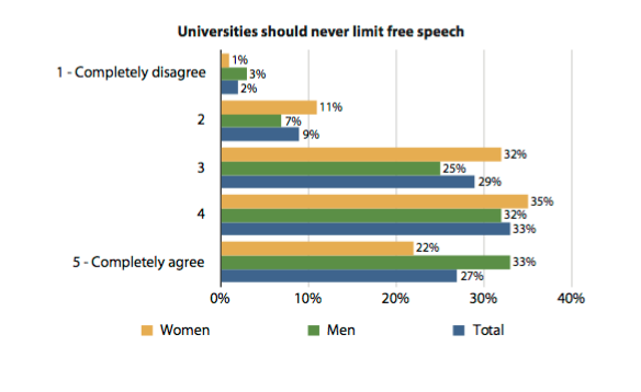 To the extent that they have scarily illiberal ideas, I think the interesting question is why? Based on my daughters' experiences at British universities, I blame lecturers of my generation. We may have won the debate in 1970s student politics about "No platform for fascists and racists" on a pure free speech argument. But then most of us on the winning side went into productive work and many of the "no platform" losers went into academia. They have indoctrinated subsequent students to the point where only 27% of them (and only 22% of women) believe that "Universities should never limit free speech".