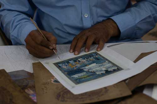 Also prominently displayed are two enormous, elegant containers which accompanied another Maharajah to London for a coronation. He didn't trust the local water and so took then filled with Jaipur water for his consumption during his stay. One of the best parts of the visit was time spent with a local gentleman in the arts and crafts gallery of the palace. He demonstrated his skills with a "brush" with just one hair by executing a sketch and then showed us his work. I bought a splendid piece to add to my little art collection back home. Here he is, signing it with that "brush".