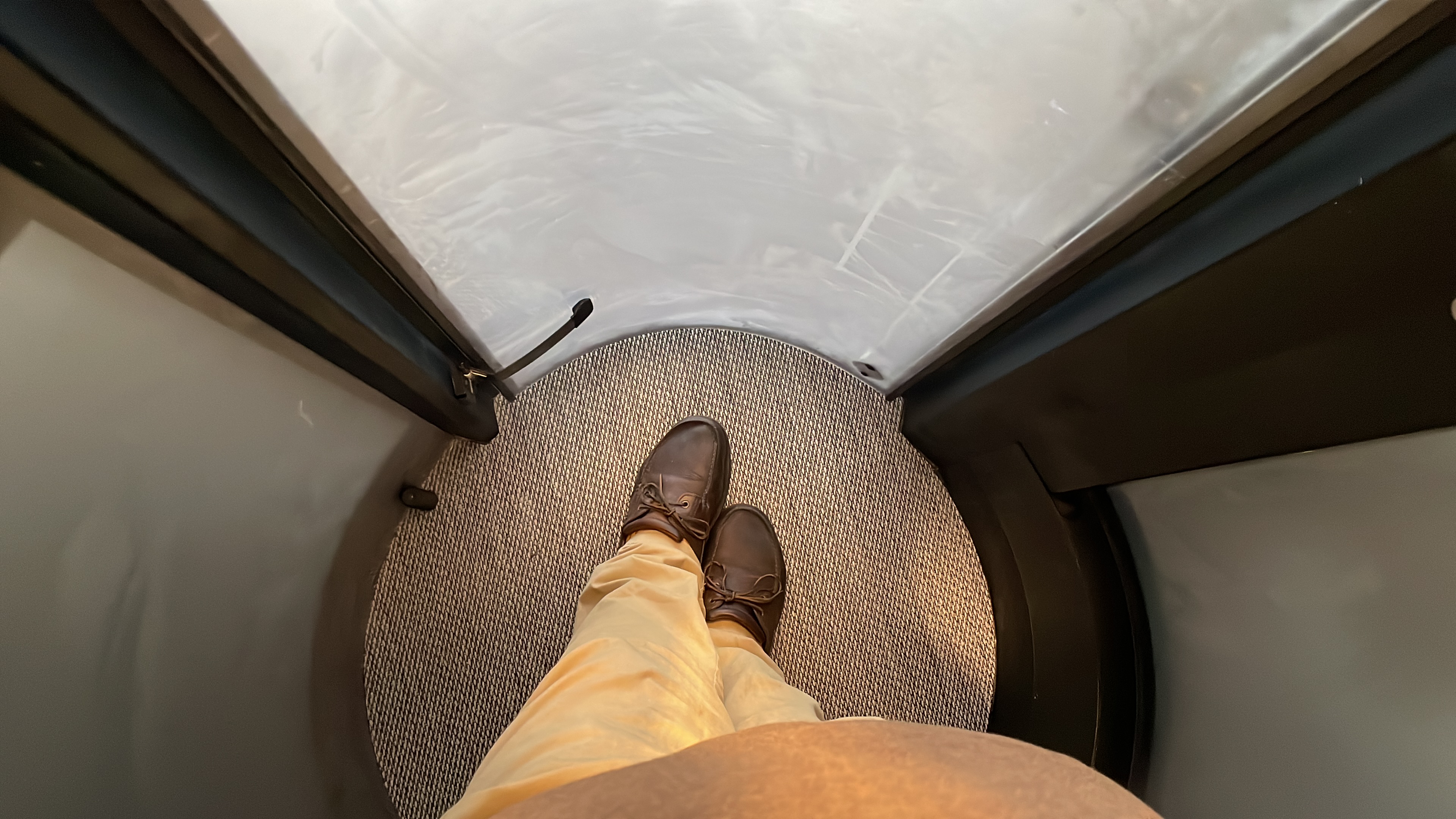 Having showered and dressed I had an hour to spare before I needed to set off. I decided to check out the sea views my friend had told me about from the top floor of the house. They were indeed superb. The house has a lift – a tiny tubular device for one person only. I thought I'd try it out and set off to the ground floor. I almost made it. It stuck a mere six inches above the ground and I was trapped in a coffin-sized space. As I tried to escape, it became hot and sweaty and the glass tube misted up. It was too small in there even to sit down while awaiting help.